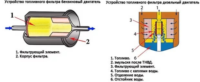 Den första används vid arbete med bensinmotorer och dess syfte är att skydda elementen i insprutningssystemet, såväl som cylinderfoder, kolvar och förhindra deras förtida slitage. Alla operationer utförs genom att rengöra bränslet från främmande föroreningar (som är lika med eller större än 10 mikrometer).Filter av annan typ fungerar på dieselmotorer och är utformade för att förhindra att inte bara föroreningar kommer in i bränslet, utan också vanlig fukt, som nominellt finns i små volymer i själva bränslet. Denna typ av filtreringsanordning kan fånga upp fina partiklar så små som 3 mikrometer. Dessutom är dagens filter som fungerar på dieselfordon utrustade med olika skyddssystem som förenklar deras underhåll och gör att samma filter alltid kan användas i mer än ett år (vilket trots allt kommer att vara direkt beroende av bränslekvaliteten) . Bland dessa filter kan följande gradering urskiljas: