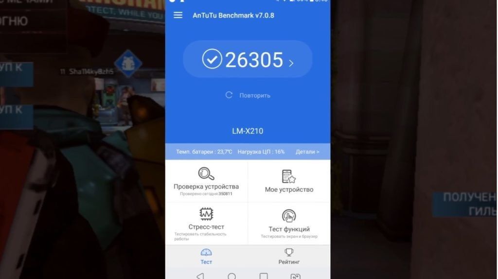 Resultaten i det syntetiska Antutu Benchmark-testet är mer än blygsamma. Detta var att vänta.Enheten får bara 26 305 poäng. För aktiva spel är en smartphone endast lämplig om användaren inte siktar på de mest besvärliga av dem, som Real Racing 3, Vainglory eller Modern Combat 5. För att testa och njuta av sådana leksaker behöver du en kraftfullare enhet.