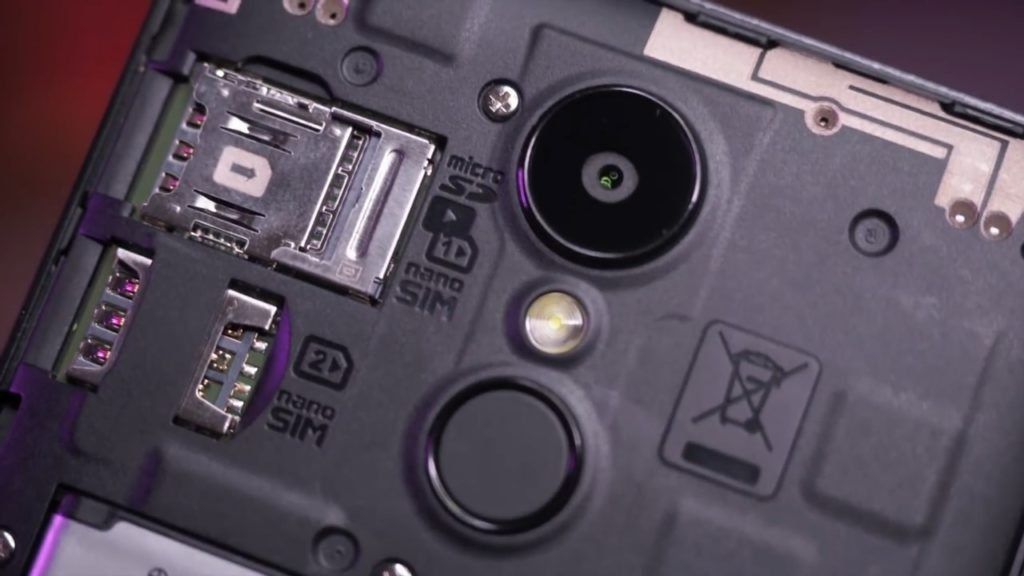 På baksidan av enheten finns en högtalare, blixt och kamera. Under bakstycket finns en Micro SD-kortplats och två platser för SIM-kort.