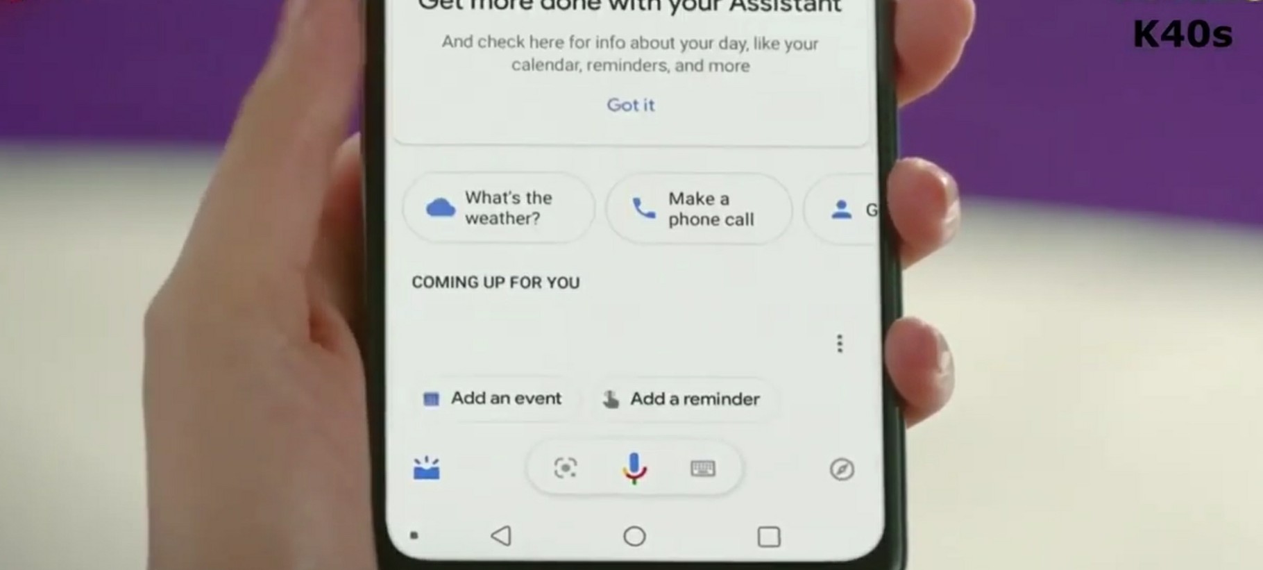 LG K40S kör Android 9 Pie. Den senaste versionen av operativsystemet låter dig få ut det mesta av telefonens interna "stoppning". Användbar Google Assistant öppnas med ett klick på en knapp.