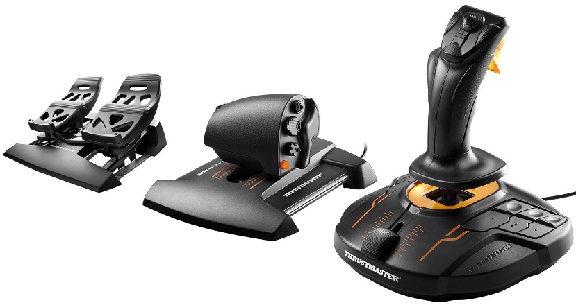 Kasama sa package ang: 2 Thrustmaster Flight Rudder Pedal, ang control lever ng Thrustmaster Weapon Control System at ang joystick mismo ng Flight Control System.