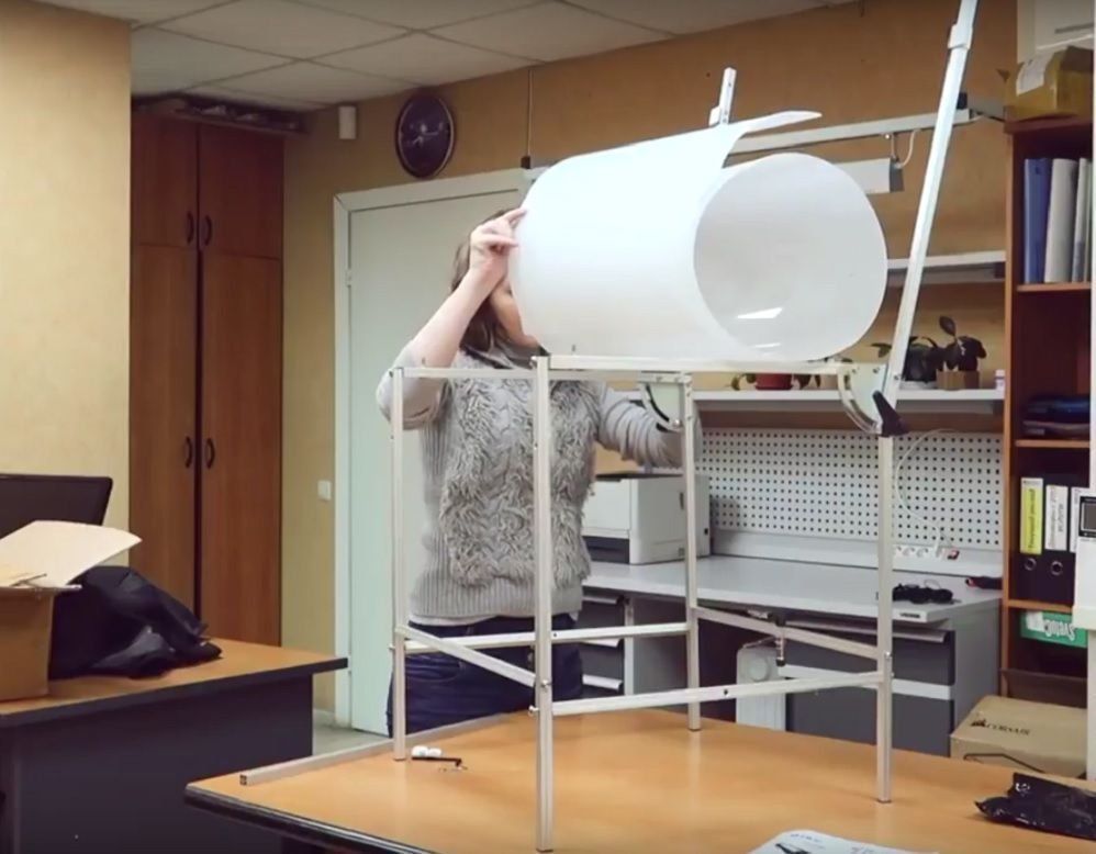 Ang canvas ay gawa sa siksik na translucent na matte na plastik, na pumipigil sa liwanag na nakasisilaw at pagbaluktot ng light refraction. Ang liwanag na temperatura ay pinananatili. Ang likod ng talahanayan ay maaaring magbago ng posisyon, na maginhawa para sa advertising at 3D shooting.
