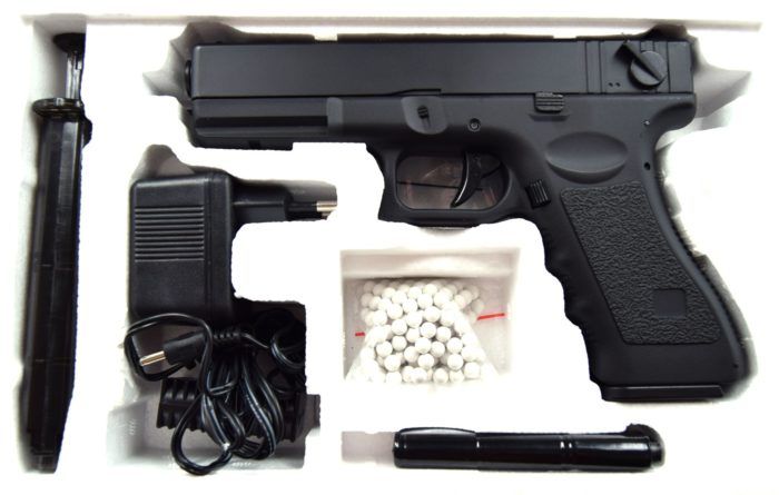 Mga karaniwang kagamitan (pistol, magazine, bala, bola, baterya + charger, manual ng pagtuturo).