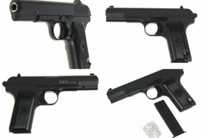 Ginawa sa Hong Kong (Galaxy). Isang kopya ng TT combat model. Ang hitsura at kalibre (6 mm) ay ganap na napanatili mula sa orihinal. Ang prinsipyo ng operasyon ay isang spring-loaded pistol na may isang solong mode ng pagpapaputok. Talagang hindi para sa lahat, dahil ang manu-manong pag-cocking ng trigger ay magpapahirap sa mga tagahanga ng automation. Magazine para sa 11 rounds, rate ng sunog hanggang sa 70 m.