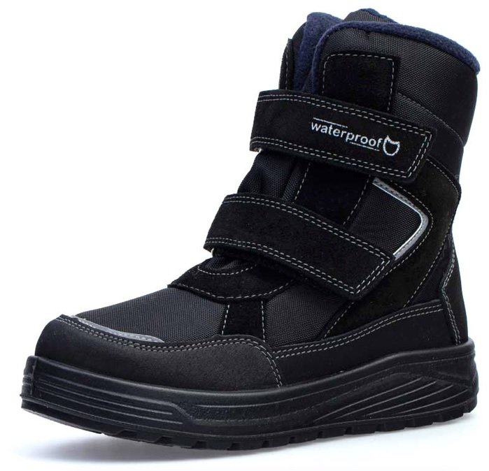 Ang mga bota ng lamad ng naka-istilong disenyo ay mag-apela sa sinumang batang lalaki. Ang hanay ng modelo ay ipinakita mula 23 hanggang 27 na laki. Available sa black at blue na may magandang pattern sa gilid.