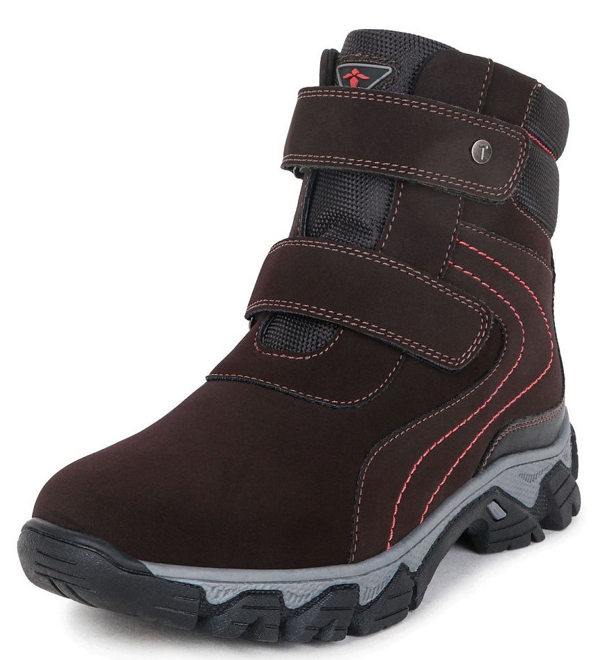 Ang mataas na lamad na bota para sa mga lalaki ay gawa sa suede at tela (itaas na bahagi). Ang panloob na lining ay faux fur. Ang insole ay gawa sa parehong materyal at maaaring alisin kung kinakailangan.