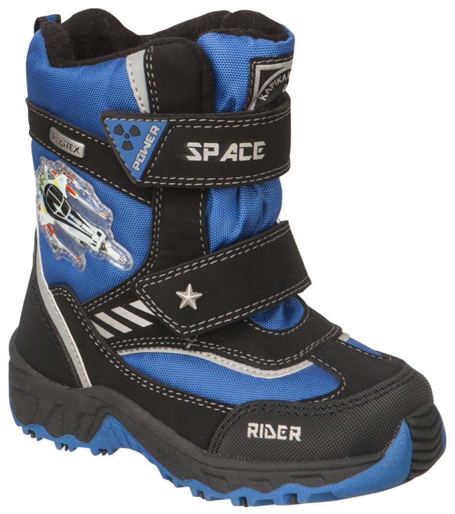 Ang solong gawa sa malambot na polymer na materyal na may anti-slip na ibabaw, kaya ang mga sapatos ay magaan at kumportable. Ang mga bota ay nakakabit sa shin na may espesyal na Velcro, at sa panlabas na bahagi ng produkto ay may mga reflector. Ang modelo ay magagamit sa madilim na asul at itim na kulay.