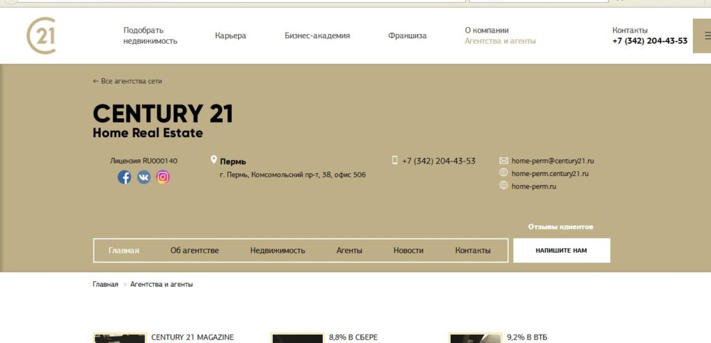 Ahensya ng internasyonal na network «Siglo 21» (USA). Ang kumpanya ay itinatag noong 1971 (California, USA). Mayroon itong 131,000 ahensya, 10,000 sangay sa 83 bansa. Sa Russia, sinimulan ng kumpanya ang trabaho nito noong 2007, kinakatawan ito sa 34 na lungsod - 1200 ahente, 60 sangay.