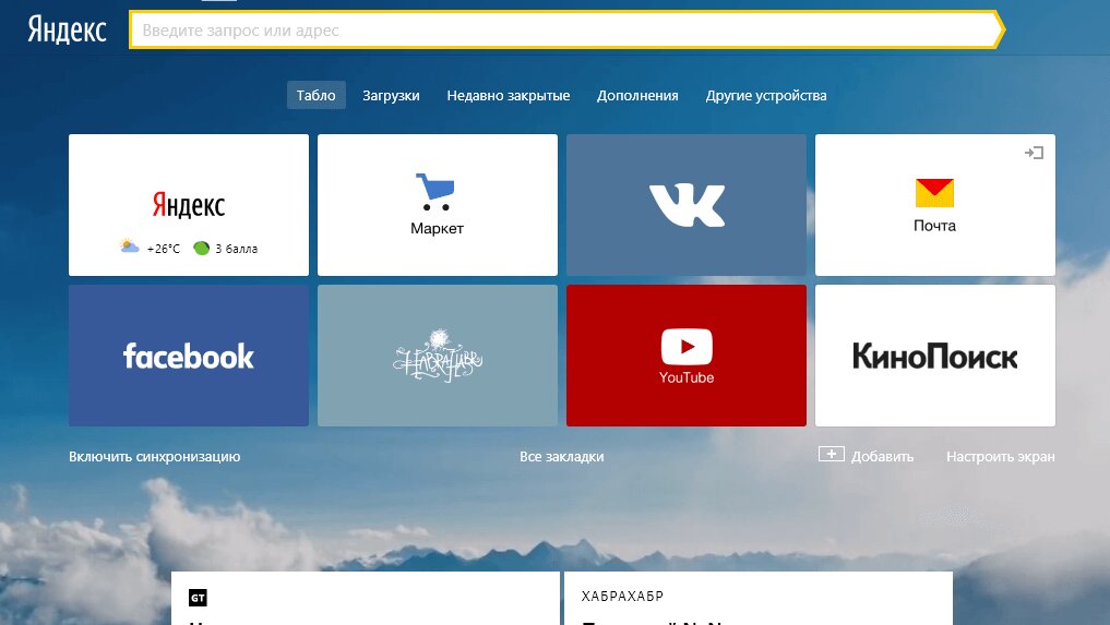 Ang pangunahing pahina ay naglalaman ng isang bar ng mga bookmark ng mga binisita na site, balita