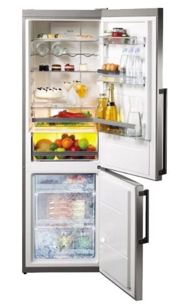 Refrigerator na may dalawang pinto, ang freezer ay matatagpuan sa ibaba. Ang defrosting ay isinasagawa sa pamamagitan ng drip system. Pabahay na kulay abo, gawa sa metal at plastik. Ang mga istante sa pangunahing seksyon ay gawa sa salamin, lumalaban sa epekto. Mayroong isang freshness zone at isang kahon para sa pag-iimbak ng mga prutas at gulay. Ang yunit ng pagpapalamig ay ganap na magkasya sa anumang interior ng kusina.