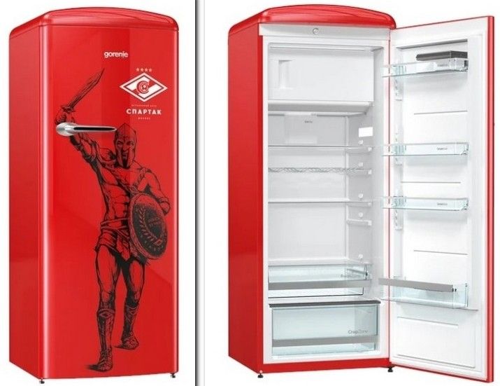 Ang isang free-standing refrigerator mula sa koleksyon ng Spartak ay binuo sa pakikipagtulungan sa Russian football club. Ito ay nilagyan ng freezer at refrigerator, FreshZone, na nagbibigay-daan sa iyo upang mag-imbak ng karne, isda, gulay at prutas, ay may proteksyon laban sa bakterya at iba't ibang mga nababaligtad na istante. Mayroong isang malawak na tray para sa 7 itlog, isang balkonahe para sa mga bote, mga may hawak ng salamin. Materyal ng kaso - metal, kulay - pula na may imahe ng isang itim na mandirigma. Ang refrigerator ay nadefrost ng drip system.
