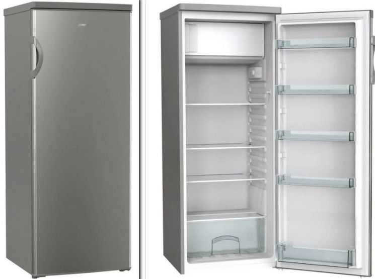 Ang isang maliit na kulay abong yunit ng pagpapalamig na may freezer at kompartamento ng pagpapalamig ay angkop para sa maliliit na pamilya o para sa paggamit sa bansa. Ang lokasyon ng freezer ay nasa itaas.