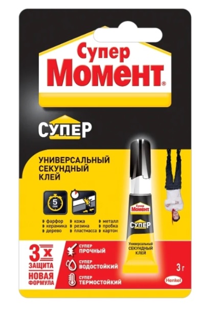 Kapag kailangan mo ng mabilis na pagkakabit ng mga piyesa, ang "Super Second Moment" ni Henkel ay magiging isang mahusay na katulong. Dahil ang modelong ito ay unibersal, maaari itong magamit upang i-fasten ang mga bagay na gawa sa plastik, kahoy, keramika, porselana o goma. Ito ay angkop din para sa mga porous na produkto na may mataas na sumisipsip na mga katangian. Upang gawin ito, ang isang manipis na layer ng "Moment Super Second" ay inilapat sa isa sa mga ibabaw ng bahagi, pagkatapos ay dapat na agad na mailapat ang isa pang bahagi.Ang parehong mga bahagi ay dapat na mahigpit na pisilin at hawakan ng ilang segundo. Kaagad pagkatapos nito, ang mga naka-fasten na bagay ay handa na para sa karagdagang paggamit. Magtrabaho nang mas mahusay sa mga guwantes at maskara. Dahil kung ang produkto ay napunta sa balat, ito ay agad na magkakadikit. Ang "Super Second Moment" ay hindi dapat gamitin para sa mga pagkaing ginagamit sa pagkain o pagluluto.