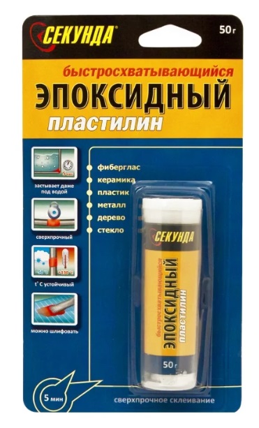 Ang produktong ito ay isang mabilis na pagpapagaling na masa, na nakakapagdikit ng mga produkto kahit sa ilalim ng tubig. Ang "Second Epoxy Clay" ay angkop para sa pagtatrabaho sa plastic, metal, salamin at keramika.Pagkatapos ng hardening, nabuo ang isang malakas na tahi na makatiis sa temperatura ng pagpapatakbo mula -50 hanggang +130 degrees. Ito rin ay lumalaban sa kemikal. Ang labis na pinatuyong tahi ay maaaring buhangin. Bilang karagdagan, ang "Second epoxy plasticine" ay ginagamit upang punan ang mga bitak at mga produkto ng selyo. Ang oras para sa kumpletong solidification ng produkto ay 5 minuto.