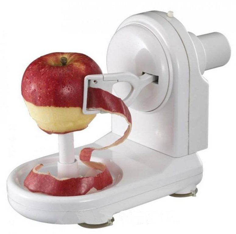 Ang kapangyarihan ay ibinibigay ng apat na elemento o isang adaptor mula sa mga mains. Ang peeler ay may maraming positibong pagsusuri. Pinuri dahil sa maliit na sukat nito at sa katotohanang ligtas itong gamitin. Kapag ginagamit ang aparato, hindi kinakailangan na hawakan ang fetus, sa gayon ay mapanganib ang mga kamay at madaragdagan ang posibilidad na maputol ang daliri gamit ang isang gumaganang kutsilyo. Ang pag-fasten at paghawak ng mga gulay ay nangyayari sa mismong apparatus nang walang interbensyon ng tao.