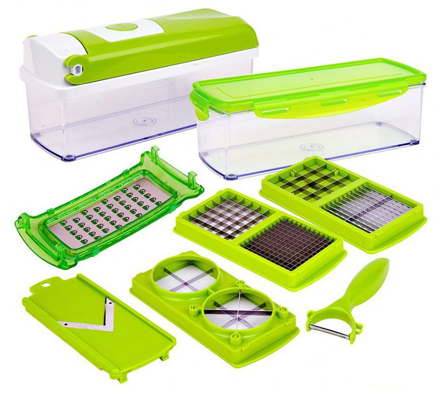 | 5 | "Nice Dicer Plus" | Presyo mula sa 600 rubles | Uri ng device - mekanikal na pamutol ng gulay; Bilang ng mga nozzle - 7 (para sa pagputol sa maliit, katamtaman, malalaking cubes, straw, para sa pagputol sa mga hiwa, isang klasikong kudkuran, isang grater-shredder, isang peeler ng gulay); Materyal - plastik. | mababa ang presyo; isang malaking bilang ng mga nozzle; pagiging simple at kadalian ng paggamit; compact size (timbang ay 430 gramo). |
