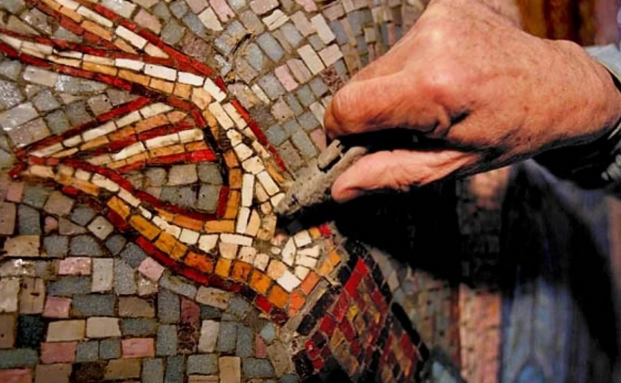 Dapat tandaan na ang isang mosaic panel, tulad ng anumang gawa ng sining, ay nangangailangan ng ilang pagpapanatili. Sa kasong ito, ginagamit ang iba't ibang mga nakasasakit na materyales: mga metal na brush, nadama na tela, mga kemikal na likido, tulad ng, halimbawa, tin oxide. Ang mga maliliit na mosaic painting, na hindi pa naka-embed sa ibabaw, ay pinoproseso kahit sa mga rotary machine, na mga talahanayan na umiikot sa isang pahalang na eroplano. Ang malalaking mosaic painting ay kadalasang nililinis ng kamay gamit ang mga kinakailangang produkto sa paglilinis.