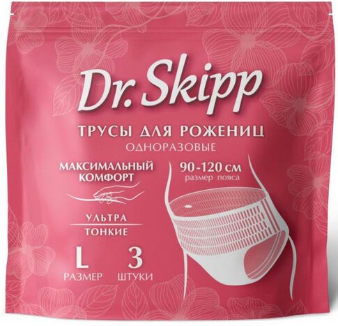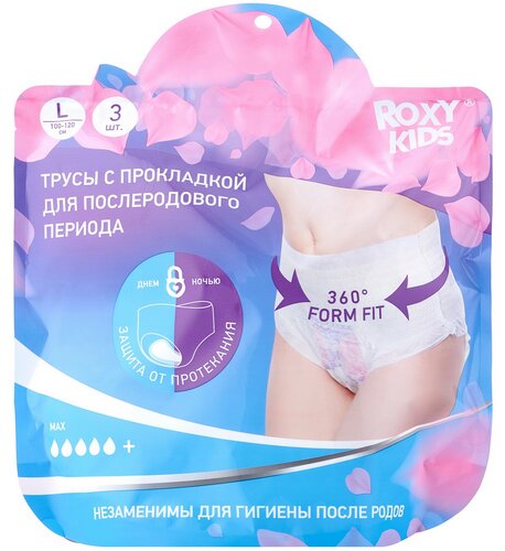 Ang set ay naglalaman ng 3 disposable panty na may pinagsamang padding sa laki L (baywang 100-120 cm).
