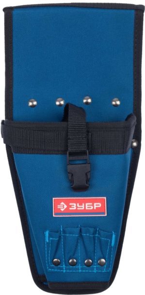 Ang isa pang kinatawan ng Zubr ay isang mobile holster para sa isang screwdriver na may isang hanay ng mga compartment para sa mapagpapalit na tooling. Tulad ng nakaraang modelo, ito ay gawa sa matibay at magaan na materyal na nakabatay sa naylon, na ginagarantiyahan ang mahabang buhay at komportableng operasyon. Ang 4 na mga compartment ay inilalaan para sa pag-iimbak ng mga maaaring palitan na elemento, kung saan ang master ay maaaring maglipat ng mga bits at drills para sa isang distornilyador. Espesyal na buttonhole upang magbigay ng pinakamatibay na pangkabit sa isang tool holster.