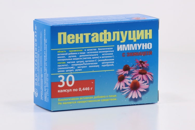 Ang mga bitamina na naglalaman ng echinacea "Pentaflucin immuno" ay idinisenyo upang palakasin ang immune system, ibalik ang katawan at labanan ang mga unang palatandaan ng sipon. Kabilang sa mga bahagi ay echinacea herb extract, bitamina C, pati na rin ang magnesium, rutin at zinc. Ang mga kapsula ay inilaan para sa paggamit ng mga taong higit sa 14 taong gulang.Ang kurso ay 2-3 linggo, 1 piraso 3 beses sa isang araw habang kumakain. Ginawa sa mga garapon ng 60 piraso.