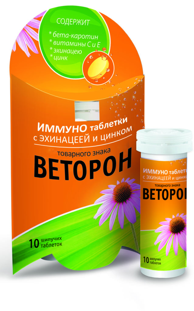 Ang kumpanya ng Belarus na NP CJSC Malkut ay gumagawa ng Vetoron Immuno sa anyo ng mga effervescent tablet, na isang biological food supplement. Ang pangkat ng mga sangkap kung saan inihanda ang mga tablet ay kinabibilangan ng echinacea, zinc, tocopherol, pati na rin ang multivitamins A at C. Ang produkto ay may antioxidant immunomodulatory at anti-inflammatory properties. Ang gamot na ito ay pinapayagang inumin ng mga taong higit sa 3 taong gulang.