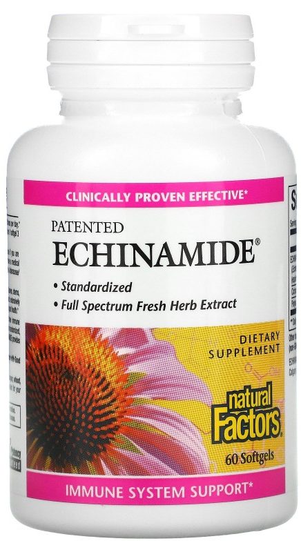 Ang Natural Factors "Echinamide" ay isa pang nutritional supplement na ginawa sa USA. Ang produkto ay ginawa sa mga kapsula, 60 piraso bawat pack. Para sa mga layunin ng pag-iwas, inirerekomenda ng mga eksperto ang paggamit ng 1 piraso dalawang beses sa isang araw.Ngunit kung nagsimula na ang sakit, dapat mong dagdagan ang paggamit sa 5 beses sa isang araw, 1 kapsula, unti-unting bawasan ang paggamit sa 3 dosis bawat araw. Ang komposisyon ng produkto ay kinabibilangan ng gelatin, gliserin, purified water, beeswax, lecithin. Kabilang sa mga sangkap ay walang mga artipisyal na kulay, iba't ibang mga preservatives, sweeteners at iba pang hindi kinakailangang mga additives, kabilang ang mga GMO.
