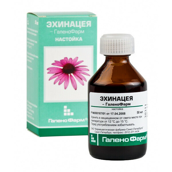 Ang GalenoPharm tincture ay ginawa sa Russia, ang komposisyon ng gamot ay kinabibilangan ng herb echinacea purpurea at ethyl alcohol (40%). Ang kulay ng solusyon ay nag-iiba mula sa maberde-dilaw hanggang dilaw-kayumanggi. Sa paglipas ng panahon, ang likido ay maaaring maging maulap, at ang isang bahagyang namuo ay maaaring mabuo sa anyo ng mga natuklap. Ang gamot na GalenoPharm ay hindi lamang immunomodulatory, kundi pati na rin ang mga anti-inflammatory effect. Magagamit sa mga bote ng 50 ml. Dapat alalahanin na ang produkto ay naglalaman ng alkohol at hindi angkop para sa mga taong wala pang 12 taong gulang, pati na rin sa mga buntis at nagpapasusong kababaihan.