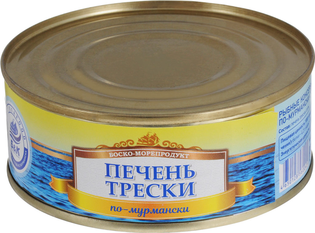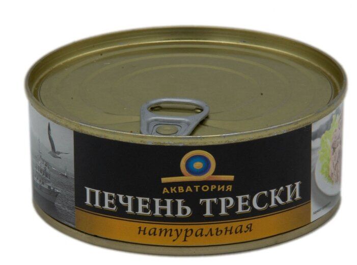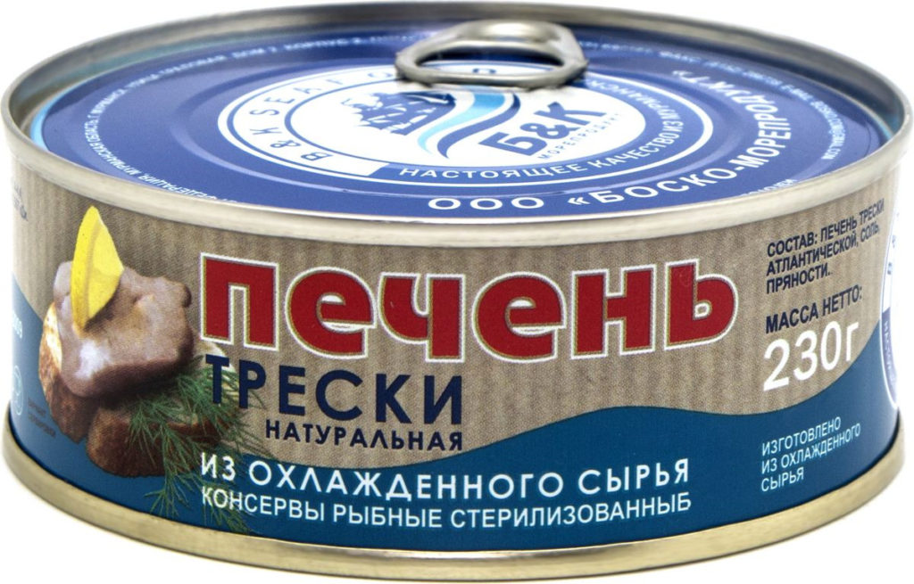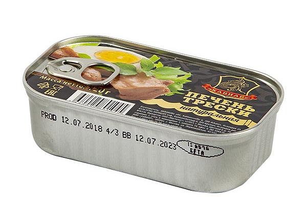 Ang bakalaw na atay ay naproseso sa natural na paraan, packaging: lata, piraso. Naka-lata sa sariling katas. Mga sangkap: bakalaw atay, asin, bay leaf. May shelf life na 2 taon. Presyo: 283 rubles.