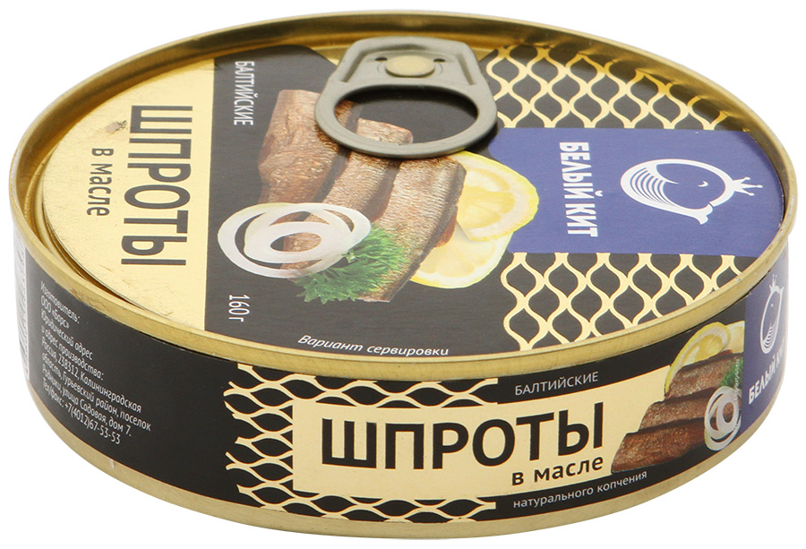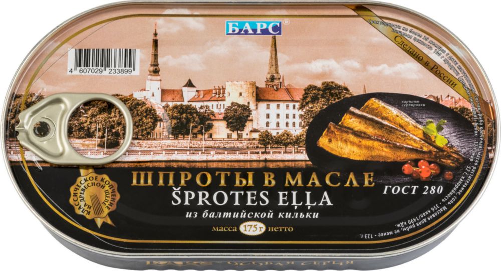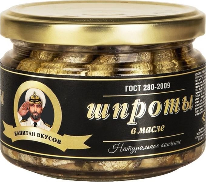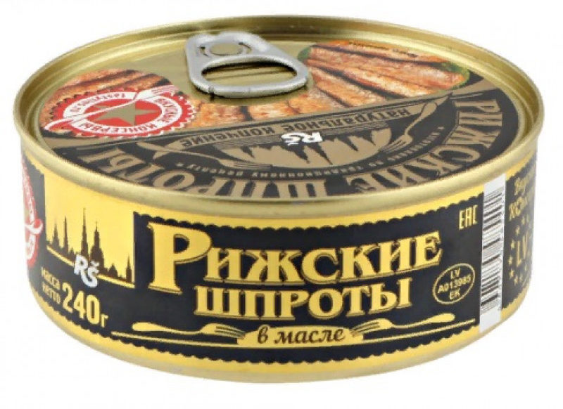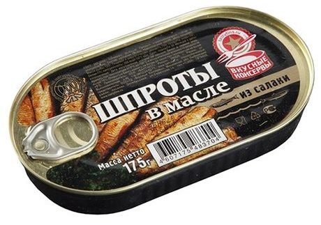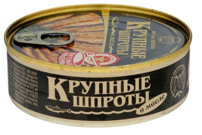 Sprat sa langis, na ginawa sa isang garapon ng salamin na may takip na bakal, na tinitiyak ang kumpletong kaligtasan at higpit. Ang mga sprat ay maaaring maiimbak sa naturang garapon nang ilang oras pagkatapos magbukas. Isda na napreserba nang walang ulo at buntot. Gastos: 152 rubles.