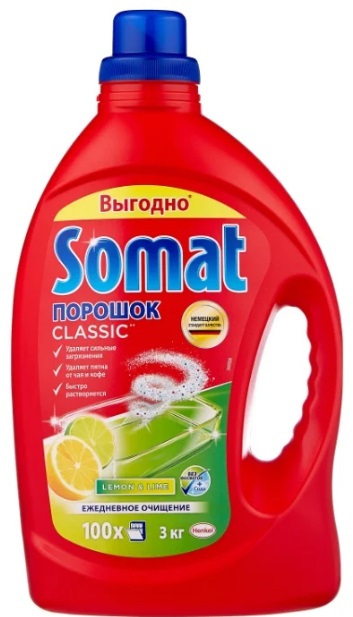 Ang pulbos ay may epekto ng soda, at ayon sa mga tagagawa, nagagawa nitong alisin ang kahit na matigas ang ulo at tuyong mga nalalabi sa pagkain sa ibabaw ng mga pinggan.Isang medyo matipid na opsyon na nagbibigay-daan sa iyo upang matukoy ang dosis, at ito ay tumatagal ng hanggang anim na buwan ng paggamit. Natutunaw ito nang maayos sa tubig, hindi bumubuo ng mga streak at hindi nag-iiwan ng mga amoy sa mga pinggan. Mayroon itong maginhawang dispenser na nagbibigay-daan sa iyo upang simple at tumpak na ibuhos ang kinakailangang halaga ng pulbos sa kompartimento. Kasama sa komposisyon ang citric acid, na ginagawang posible na madaling makayanan ang tsaa o kape na plaka sa mga tasa. Ang mga enzyme na nakapaloob sa pulbos ay nagpapataas ng kapangyarihan sa paglilinis ng produkto. Para sa pinakamahusay na epekto, inirerekomenda ng tagagawa ang paggamit ng pulbos kasama ng Somat banlawan at asin.