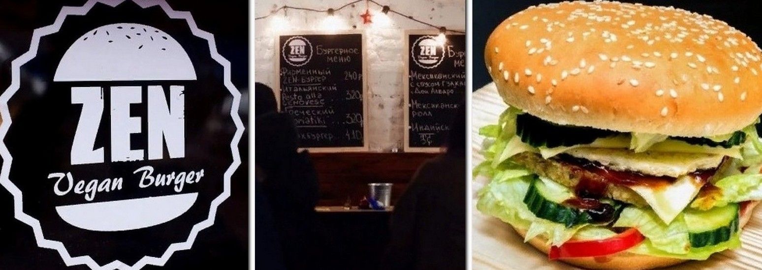 Ang sagisag ng pagtatatag na "ZEN Vegan Burger" at ang halimbawa nito ng tapos na produkto