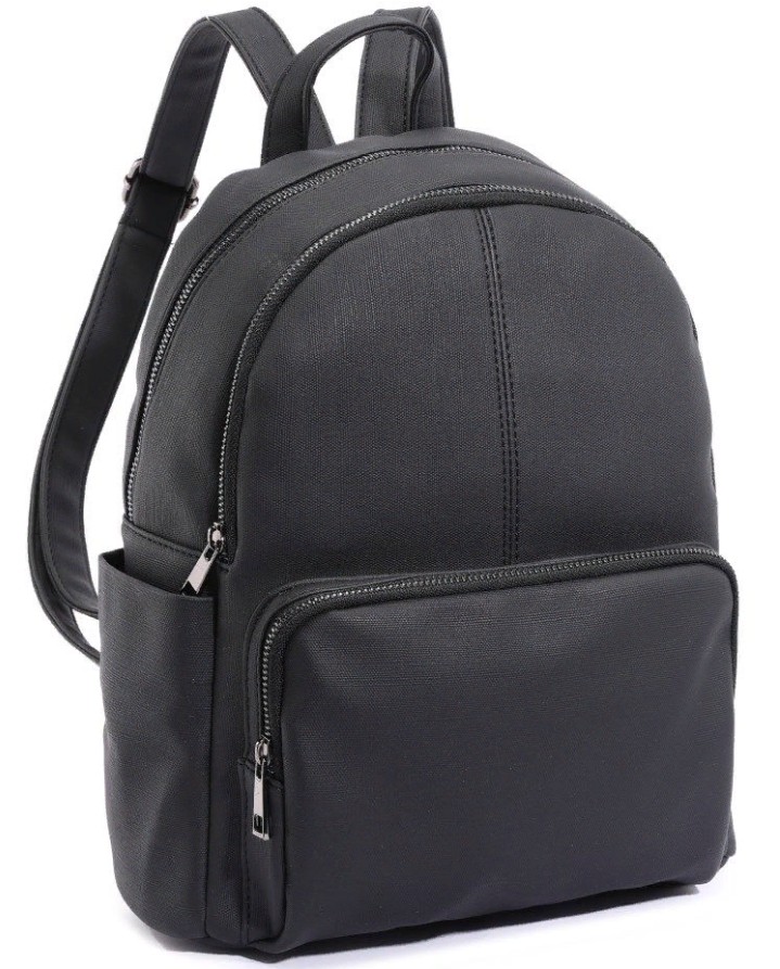 Ang matatag na bersyon na gawa sa artipisyal na katad ay kapansin-pansin para sa mahigpit nitong klasikong disenyo. Ang isang kaaya-aya sa mata na panlabas na coating, kasama ng isang gintong logo, ay ginagawang mas elegante at naka-istilong ang backpack.