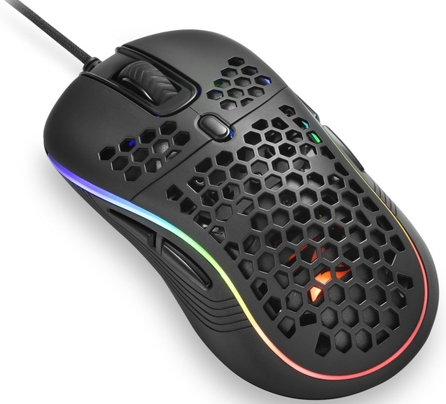 Pinagsasama ng modelong ito ang liwanag at maalalahanin na ergonomya sa isang multi-functional na disenyo na angkop para sa kaliwa at kanang mga kamay. Dahil sa istraktura ng pulot-pukyutan, ginagarantiyahan ng manipulator ng gamer na ito ang isang mahusay na pagkakahawak at perpektong gaan. Ang modelo ay tumitimbang lamang ng 78 g, na nagsisiguro sa kadalian ng paggamit sa panahon ng mahabang sesyon ng paglalaro o trabaho.