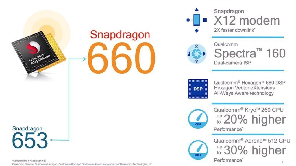 Ang puso at utak ng smartphone ay isang malakas na 8-core Qualcomm Snapdragon 660 processor. Ginawa ito gamit ang FinFET technology at ang kapal nito ay 14 nm lamang. Mayroon itong apat na Kryo 260 cores na naka-clock sa 1.8 GHz, ang iba pang apat, na tinatawag na Kryo 280, ay naghahatid ng mas mataas na pagganap at tumatakbo sa 2.2 GHz. Kumokonsumo din ito ng 60% na mas kaunting kapangyarihan kaysa sa Snapdragon 653.