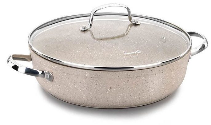 4 litrelik iyi bir hacim, tüm aile için yemek pişirmenizi sağlar. Kapak camdan yapılmıştır ve tavaya rahatça oturur. Bu nedenle, pişirme sırasında su yavaş yavaş buharlaşır ve yiyecekler sulu kalır. Model çok yönlülüğü ile ayırt edilir, ancak indüksiyon ocakları için kullanılmaz.