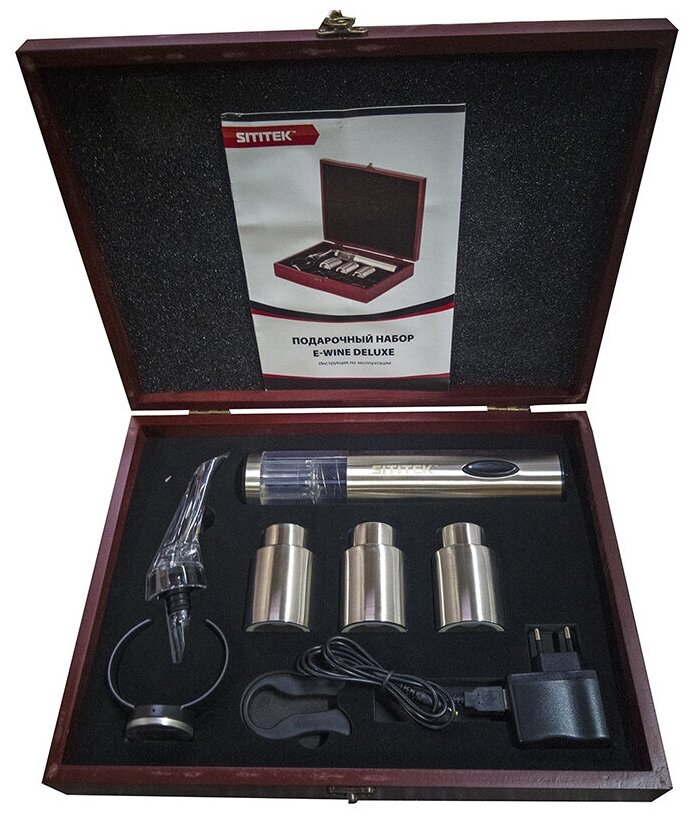 Şık ve zarif kasa, şarabın kalitesini belirlemek, doğru duruma getirmek ve mantarsız şişeyi saklamak için ihtiyacınız olan her şeyi içerir. Sadece erkekler tarafından değil, aynı zamanda iyi içecekler hakkında çok şey bilen kadınlar tarafından da takdir edilecektir.En sıkı şekilde kapatılmış kapları kolayca açmanıza olanak tanıyan, şarj edilebilir bir pille çalışan bir elektrikli tirbuşon ile donatılmıştır. Buna ek olarak, kit bir havalandırıcı, bir termometre, üç çelik vakum tapası ve bir folyo kesici içerir.