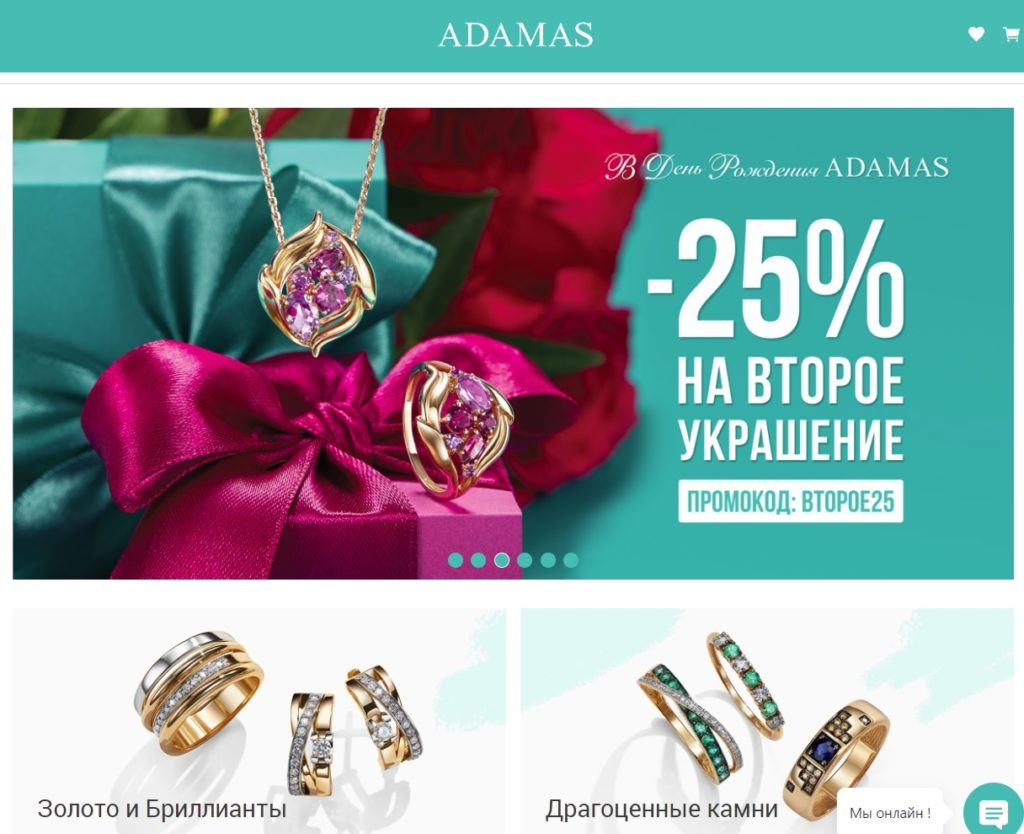 Apple Diamond, kolay gezinme ve kullanıcının beğendiği ürünü kolayca gezinmesine, seçmesine ve sipariş etmesine olanak tanıyan bir filtre sistemine sahip bir çevrimiçi mağazaya sahiptir. Site, çevrimiçi mücevher tasarımcısını kullanma ve onunla kendi benzersiz ürününüzü yaratma fırsatı sunar. "İNDİRİM" bölümünde yüzük, küpe, bilezik, kolye ve diğer ürünlerde %50 indirim bulabilirsiniz. 10.000 ruble miktarında sipariş verirken. ücretsiz kargo sağlanmaktadır.