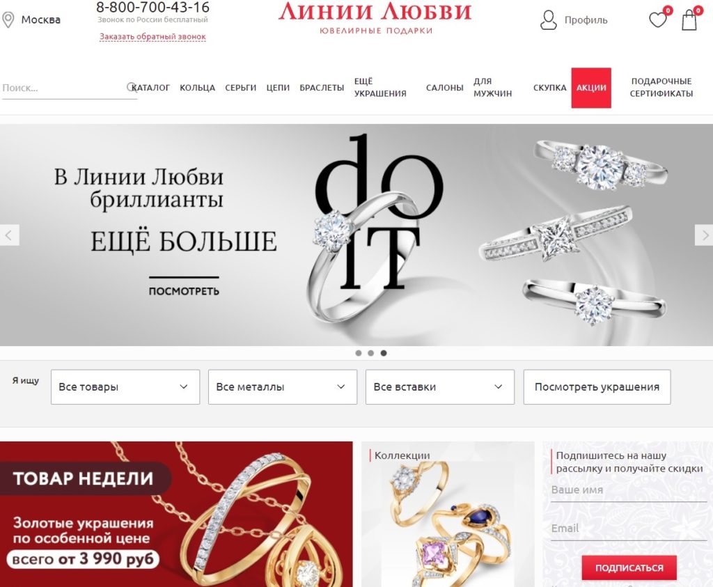 Çevrimiçi mağaza "Lines of Love", mevcut tüm öğeleri içeren bir katalog sunar, toplamda kadınlar, erkekler ve çocuklar için 30.000'den fazla farklı model bulunur. Ayrıca hem klasik tasarımda yapılmış hem de değerli taşlar ve işlemelerle süslenmiş nişan ve alyans bölümü bulunmaktadır. Kullanıcı, çevrimiçi bir tasarımcının yardımıyla birkaç basit adımda kendi alyansını oluşturabilir.