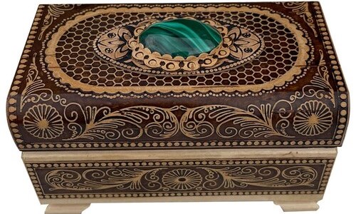 Malakit taşlı el yapımı mücevher kutusu, ahşap taban ve kadife iç döşeme, her modacıya ve sıra dışı şeyleri bilenlere uyacaktır. Ural ustaları tarafından huş ağacı kabuğu ve masif ahşaptan yapılmıştır. Ebatlar: 7.5x4.5x4.5 cm Ağırlık: 500 gr. Ortalama fiyat: 850 ruble.