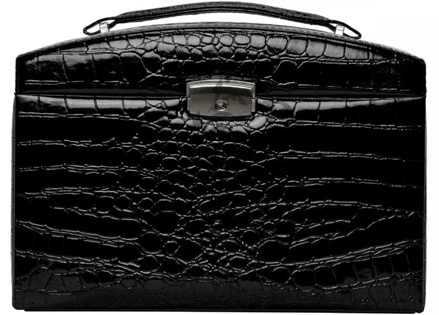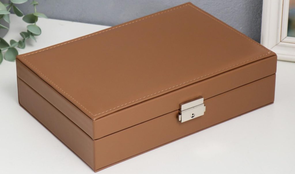 Birçok bölmeye ve katlanır yan duvarlara sahip kompakt versiyon. Birkaç farklı mücevher parçasını tek bir yerde düzenlemenizi sağlar. Saatleri saklamak için minderler sağlanmaktadır. Boyutlar: 21x21x28 cm Ağırlık: 2,4 kg. Gövde malzemesi: eko-deri. Ortalama maliyet: 8019 ruble.