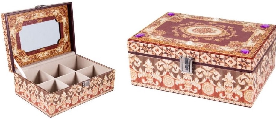 Her türlü mücevher için küçük mücevher kutusu. İçeride birkaç bölüm ve bir ayna var. Kutu malzemesi: MDF. İçeriden, bölmeler yoğun tekstillerle kaplanmıştır. Boyutlar: 13x17x22 cm Ağırlık: 1,32 kg.Katman sayısı: 4 adet. Ortalama maliyet: 5153 ruble.