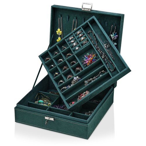 Bir sürü mücevher saklamak için harika. Ek güvenlik için bir asma kilit dahildir.Çoklu bölmeler, büyük boy bilezikler, saatler, para ve kozmetik ürünleri de dahil olmak üzere çeşitli mücevher türlerini barındırır. İç malzeme: kadife. Ebatlar: 22x18x11,5 cm Ağırlık: 600 gr. Ortalama fiyat: 2080 ruble.
