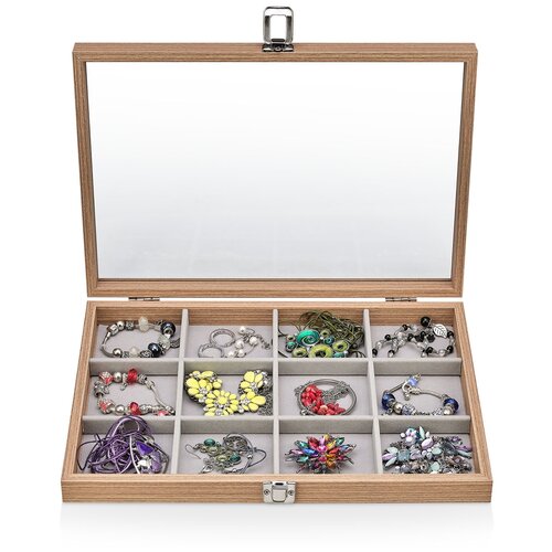 Kapak üzerindeki şeffaf mineral cam, kutuyu açmadan içindekileri görmenizi sağlar. Küçük mücevherleri (yüzükler, küpeler, kolyeler) tek bir yerde saklamak için harika bir seçenek. Ebatlar: 35x24.5x5 cm Ağırlık: 850 gr. Ortalama fiyat: 1620 ruble.