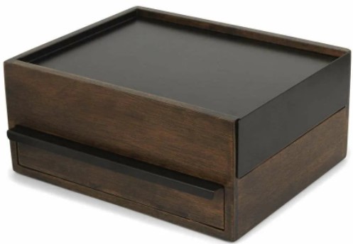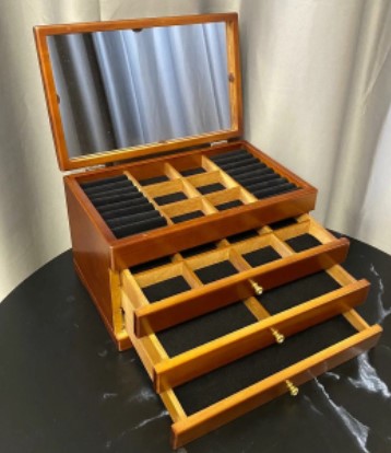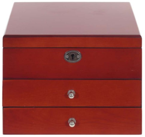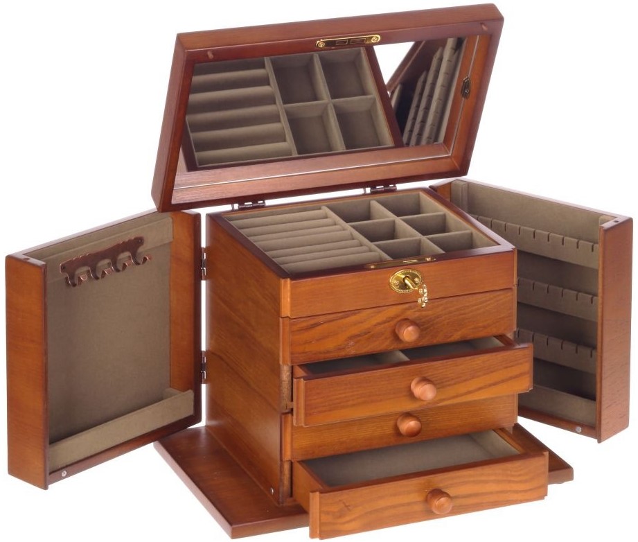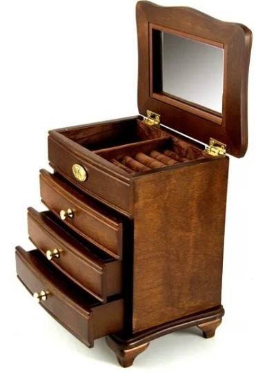 Bu geniş ahşap kutu şifonyer şeklinde olup küçük bir kilidi vardır. İç bölmeler kadife kumaşla kaplanmıştır, saklama sırasında aksesuarların zarar görmemesi sağlanır. Muhteşem tasarım her iç mekana uygundur, fazla yer kaplamaz, hem tuvalet masasında hem de dolabın içinde bırakılabilir. Maliyet: 5205 ruble.
