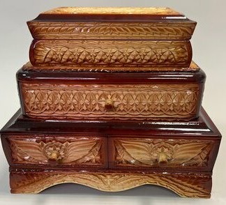 Oyma desenlerle elle masif ahşaptan (titrek kavak) yapılmıştır. Çeşitli aksesuarların veya kozmetiklerin saklanması ve iğne kadınları için uygundur. Sürgülü mekanizmalı 4 büyük bölmesi vardır. Bölmelerin içi kalın pamuklu kumaşla kaplanmıştır. Maliyet: 6300 ruble.