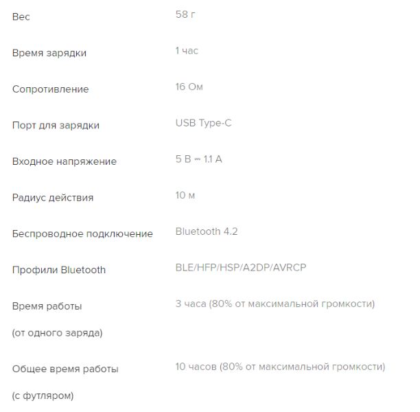 100% چارج سے، گیجٹ تقریباً 70% کے حجم میں تقریباً 3 گھنٹے تک کام کرتا ہے۔ وہ الگ الگ بیٹھتے ہیں اور اکثر ایسا ہوتا ہے کہ ایک ائرفون پہلے ہی مر چکا ہوتا ہے جبکہ دوسرا 10-20 منٹ تک کام کرتا رہتا ہے۔ کیس کی بیٹری کی گنجائش ڈیوائس کو 3 بار ری چارج کرنے کے لیے کافی ہے، اس طرح گیجٹ کے کام کرنے کے کل وقت میں 10 گھنٹے تک اضافہ ہوتا ہے۔