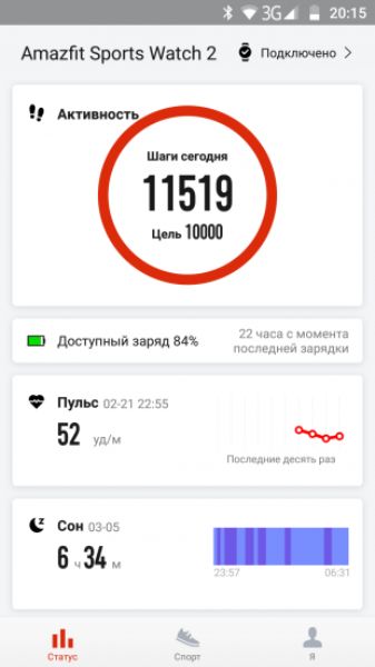 مرکزی ڈسپلے موجودہ اشارے دکھاتا ہے: موجودہ دن کے لیے قدموں کی تعداد، دل کی دھڑکن اور رات کو نیند کا دورانیہ۔ اگلی قسم میں، مشقوں کے اعدادوشمار کا مطالعہ کرنا ممکن ہے اور آخر میں، تیسرا حصہ پروفائل سیٹنگز، پروگرام اور خود Amazfit Watch 2 کے لیے ہے۔