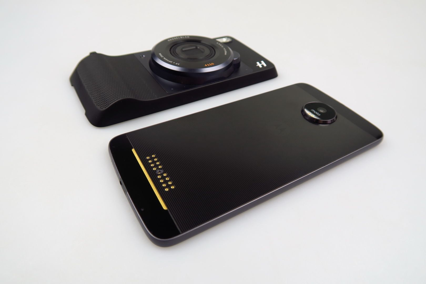 Motorola Moto Z لائن کے آلات کا آخری ماڈیول کیمرہ ہے۔ ماڈیول اسمارٹ فون کو ایک چھوٹے کیمرے میں تبدیل کرنے دیتا ہے۔ ایک میٹرکس اور ایک لینس پچھلے پینل سے منسلک ہیں، اور کمپن کام کے لیے تیاری کی نشاندہی کرتی ہے۔ظاہری شکل 5.5 انچ کے اخترن کے ساتھ ایک ڈسپلے ہے - پیچھے، اور انگلیوں کے لئے ایک پروٹروژن کے ساتھ ایک آرام دہ ربڑ والی رہائش کے سامنے، کافی سائز کا زینون فلیش اور ایک عینک۔ لینس ایک سٹیبلائزر سے لیس ہے۔ آپٹیکل میگنیفیکیشن دس گنا۔ ماڈیول کے اوپر دو کلیدوں سے لیس ہے: ایک کیمرے کو تیزی سے آن کرنے کے لیے ڈیزائن کیا گیا ہے، اور دوسرا شٹر بٹن ہے۔ دوسرے بٹن کے اوپر میگنیفیکیشن کو ایڈجسٹ کرنے کے لیے ایک لیور ہے۔