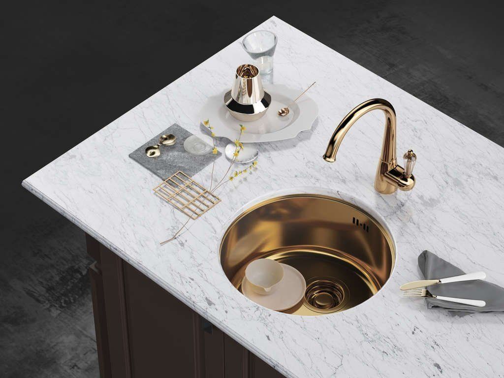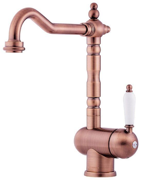 ایک ہینڈل کے ساتھ ماڈل - لیور، پانی کے فلٹر پر سوئچ کیے بغیر۔ ریٹرو انداز میں بنایا گیا۔ پیتل سے چڑھا ہوا پیتل کا جسم لمبے عرصے تک رہے گا اگر اسے احتیاط سے سنبھالا جائے۔ ٹونٹی کنڈا ہے۔ مکسر ایک آسان اضافی فنکشن سے لیس ہے - ایک پیچھے ہٹنے والا ٹونٹی۔ یہ ڈیزائن برتنوں اور مصنوعات کو دھوتے وقت سنک کی دیواروں اور اس کے ارد گرد چھڑکنے کا مسئلہ حل کرتا ہے۔ اس قسم کے ٹونٹی کو سنک اور باتھ روم میں استعمال کیا جا سکتا ہے۔