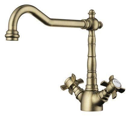 روایتی ٹونٹی کی شکل کے ساتھ ڈبل لیور ٹونٹی۔ ہر والو ایک مخصوص پانی (گرم اور ٹھنڈا) کے لیے ذمہ دار ہے۔ جسمانی مواد - قدیم پیتل کی تکمیل کے ساتھ پیتل۔ شاندار ظہور کے ساتھ ایک کلاسک ماڈل. تھرموسٹیٹ اور ایکو موڈ کی عدم موجودگی اسے کم مقبول نہیں بناتی ہے۔ ٹونٹی کو باتھ ٹب پر نصب کیا جا سکتا ہے یا افقی طور پر سنک کیا جا سکتا ہے، جیسے کہ زیادہ تر ملتے جلتے مصنوعات۔ ٹونٹی ایک ایریٹر نوزل کے ساتھ آتی ہے۔ ٹونٹی کی اچھی لمبائی آپ کو کسی بھی شکل کا بڑا سنک حاصل کرنے کی اجازت دیتی ہے۔